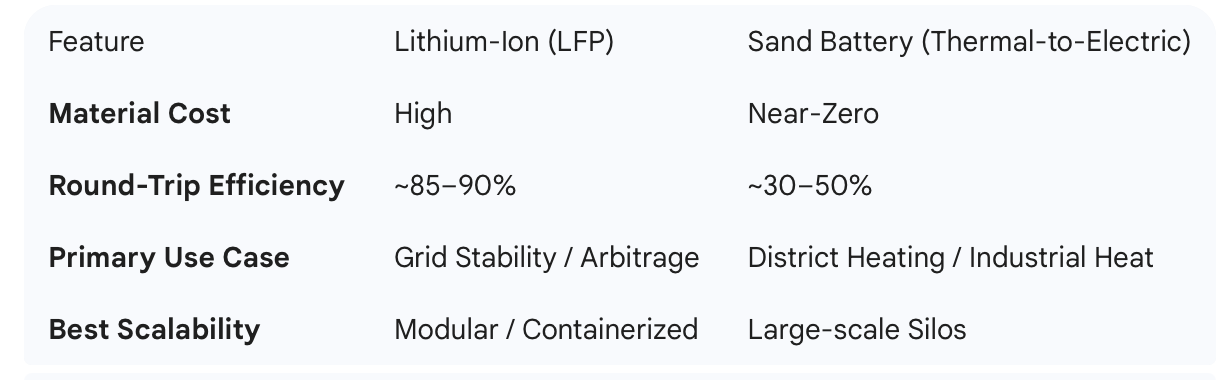 Sand batteries are brilliant when the "output" is heat. If you are Polar Night Energy in Finland and you’re using that sand to provide district heating for a city, your efficiency is nearly 100%. You’re storing heat and delivering heat. That is a win.